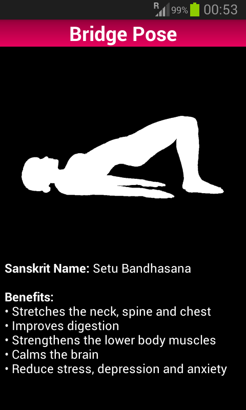 Using this app will help you to relieve stress, get flexible and calm your mind. The daily yoga routine contains 10 poses or exercises. Do it daily to create a toned, flexible and strong body. Yoga helps you to look and feel younger than your age. Improve your athletic performance. Doing yoga daily is good for your body.