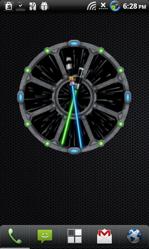Star Wars with the Millennium Falcon window with lightsaber as hands, green for the hour and blue for the minutes.