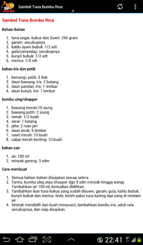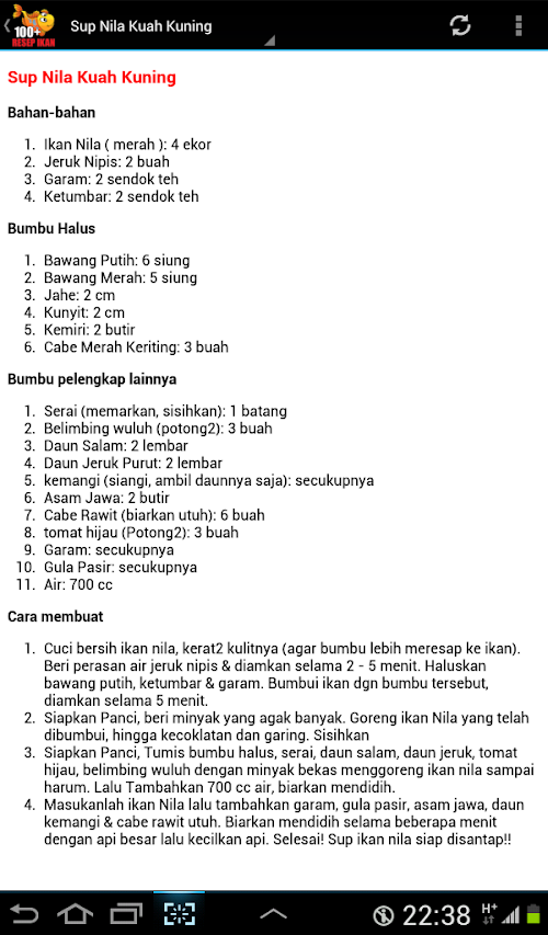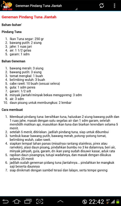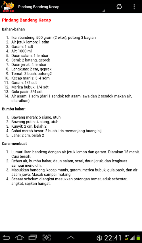 Aplikasi ini berisi 100+ variasi resep masakan berbahan dasar ikan. Berbagai macam ikan dan cara mengolahnya menjadi hidangan yang lezat ada di sini. Apilkasi ini pas buat yang baru saja belajar maupun yang sudah ahli, karena terdapat tingkatan resep mulai dari yang sederhana sampai yang lumayan ribet. Tapi jangan khawatir, di sini setiap resep dijelaskan secara rinci bahan, bumbu, dan cara mengolahnya. Sehingga bila semua diikuti dengan tepat hasilnya pasti memuaskan.