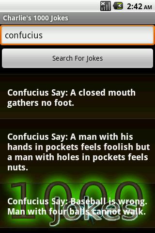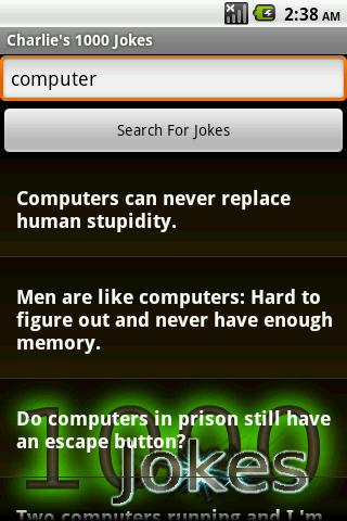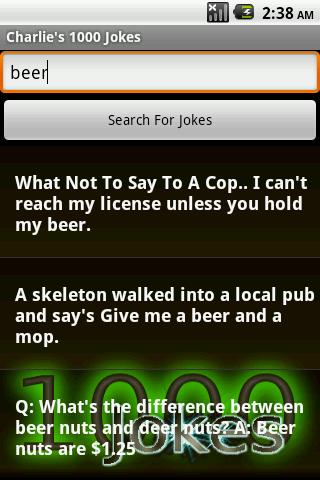 This app contains a database of over 1,000 jokes and growing The jokes are in a searchable database of jokes. Simply enter a key word in the search box to get a list off all jokes that use that key word.