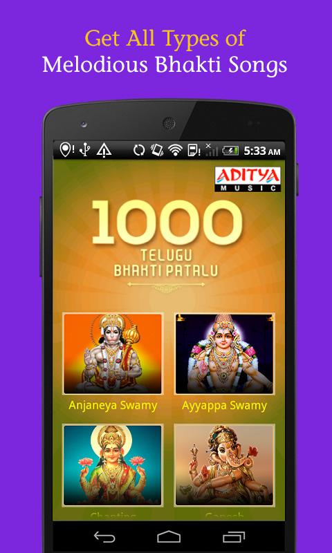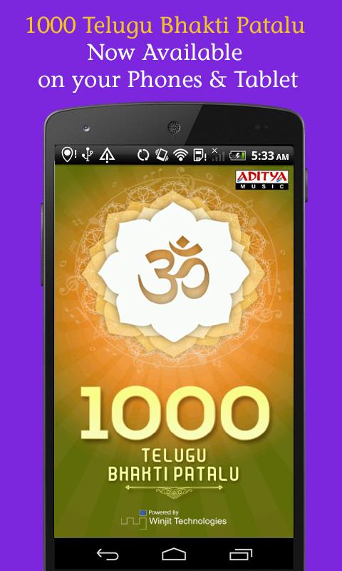 Forget downloading different apps to listen to the songs of various Gods. Aditya Music along with Winjit Technologies brings to you 1000 Telugu Bhakti Patalu in just one app.