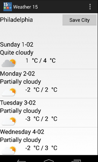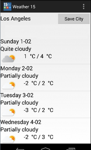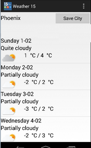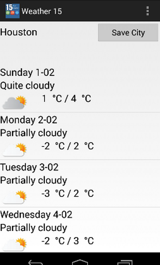 **You can use "Save the City" button for shortcut of your city. When you save the city that you want to see its 15 days weather results, app will automatically show the 15 days weather for the city in next usages.