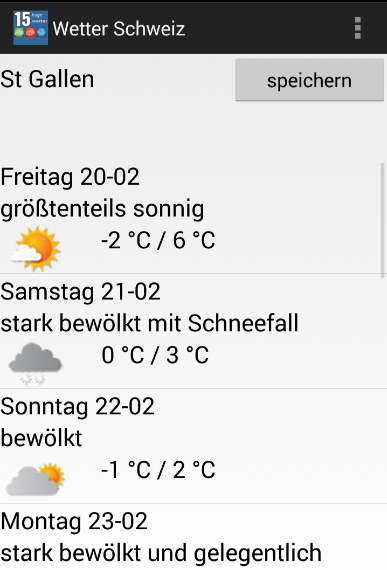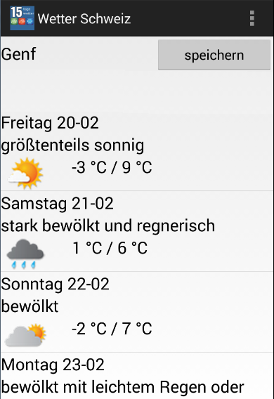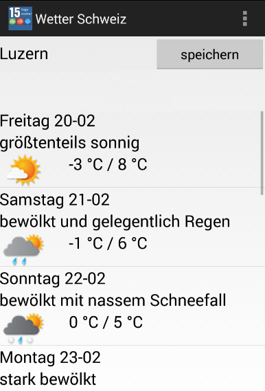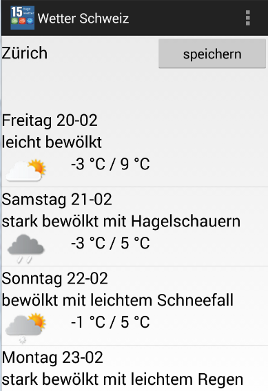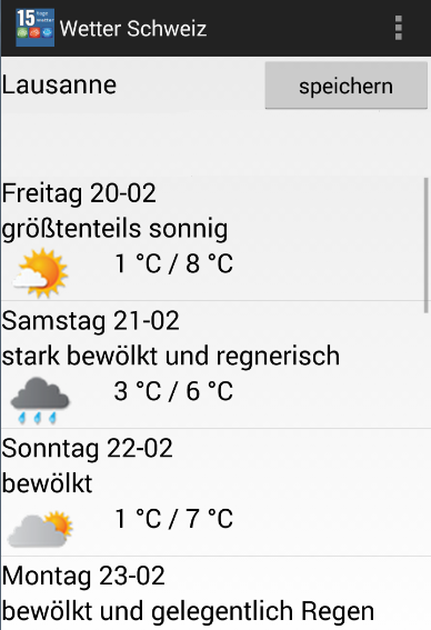 ** 15 days weather forecast app for Switzerland, needed to have internet access for the use of current weather data.