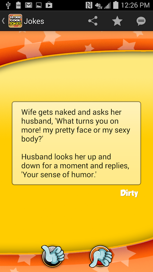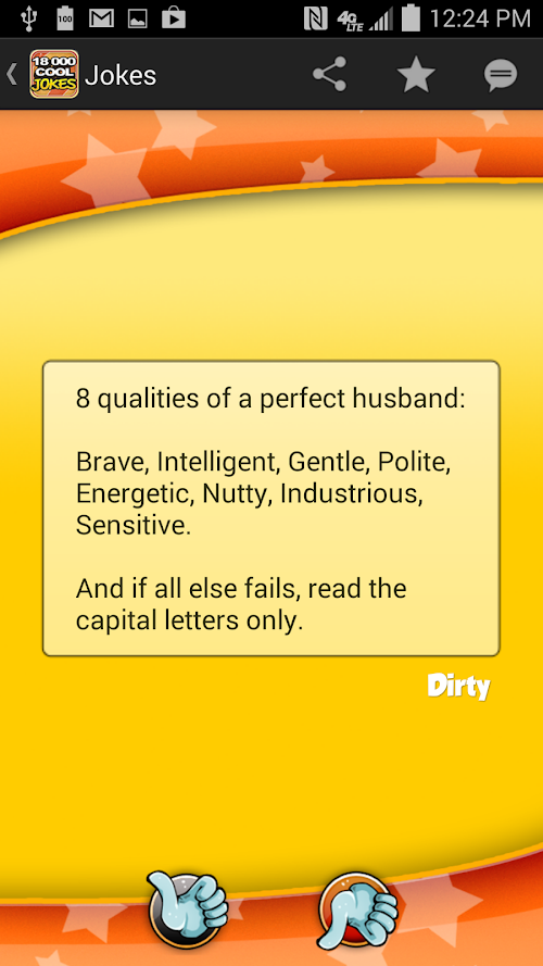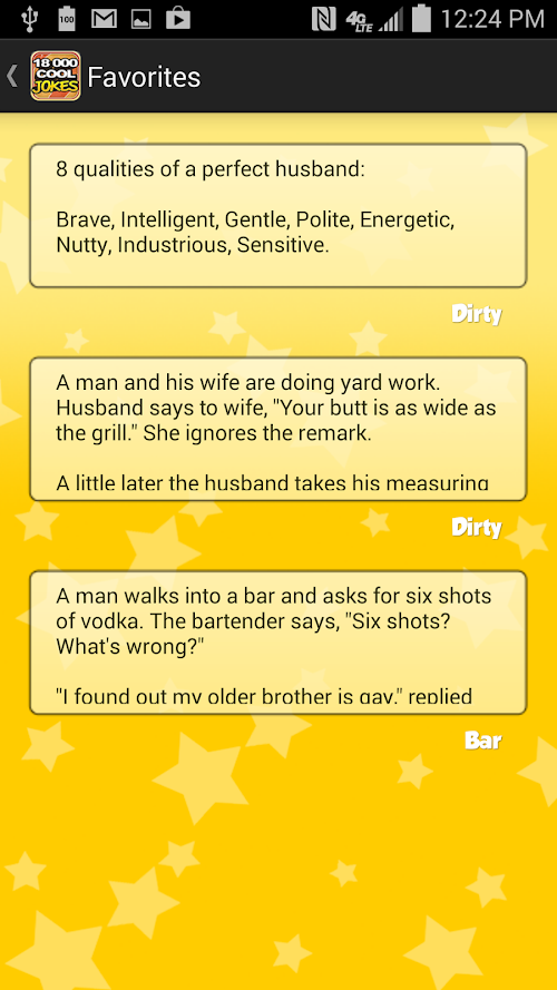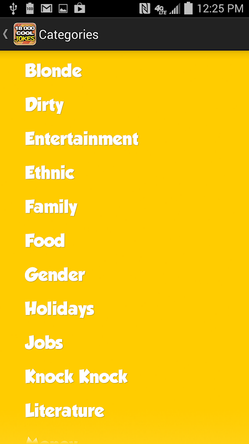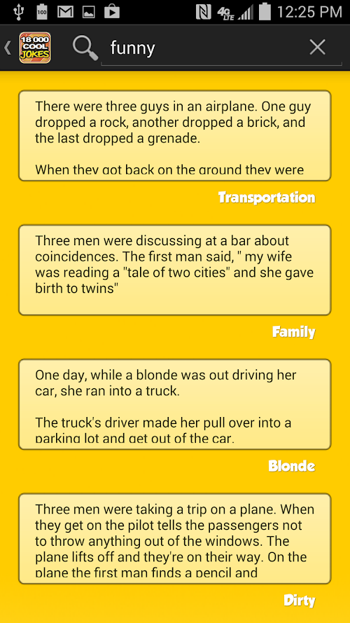Have you ever been in a company through friends and family, telling each other jokes? 18,000 COOL JOKES is an app that will always give you more and more jokes to tell and laugh. And if you just feel like wasting 5 minutes, you can always open 18000 Cool Jokes and put the smile on :)