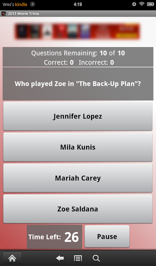 Movie trivia game that will challenge your knowledge of all the major movie releases from 2010 to 2015, including Harry Potter, the Twilight series, the Iron Man series, The Avengers, Man of Steel, The Dark Knight Rises, The Hunger Games, The Amazing Spider-Man, Brave, The Hobbit, Transformers 3, Pirates Of The Caribbean 4, Fave Five, Cars 2, Man of Steel, Monsters University, Fast & Furious serious, Star Trek, Thor, The Hangover 2, Bridesmaids, Kung Fu Panda 2, Captain America, X-Men: First Class, Rio, Super 8, Green Lantern, Rango, Gnomeo and Juliet, Rise Of The Apes, Battle: Los Angeles, Bad Teacher, Red Riding Hood, Limitless, Just Go With It, Cowboys & Aliens, The Smurfs, Hop, The Green Hornet, Zookeeper, Justin Bieber, No Strings Attached, Mr. Popper's Penguins, Source Code, Scream 4, The Adjustment Bureau, Water For Elephants, The Lincoln Lawyer, Crazy, Stupid, Love, I Am Number Four, Insidious, Friends With Benefits, Mission: Impossible, Ted, Sherlock Holmes and more.