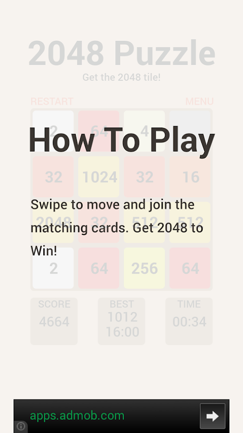 Swipe to move the tiles, when two tiles with the same number touch, they merge into one.