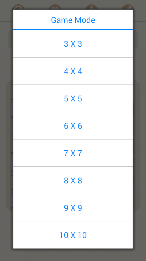 This game contains original 4x4 board , also contains 3x3, 5x5, 6x6, 7x7, 8x8, 9x9, 10x10 board.