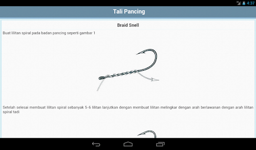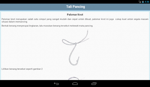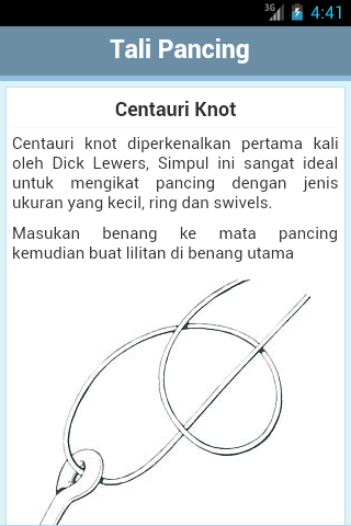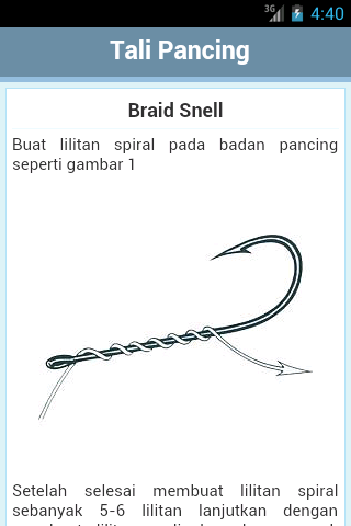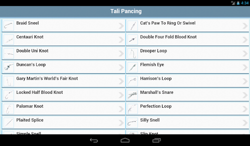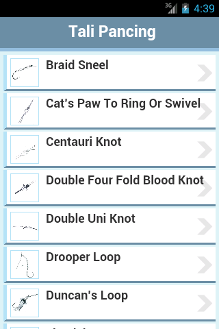 Di dalam aplikasi ini terdapat 22 macam simpul pancing dan cara mengikat tali pancing beserta langkah dan gambar panduan yang bisa Anda pelajari dan langsung di praktekkan dalam kegiatan memancing Anda !