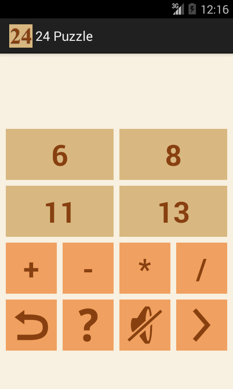 The object of the game is to make the number 24 from the four numbers in the puzzle. You can add, subtract, multiply and divide. Use all four numbers, but you can use each number only once. You do not have to use all four operations.
