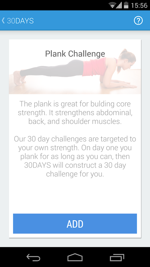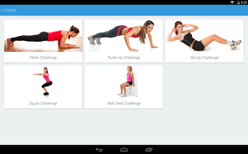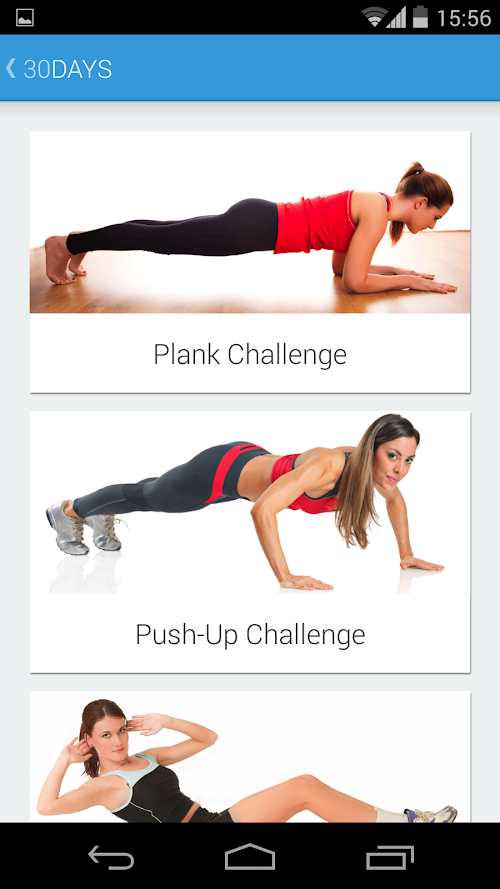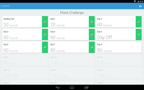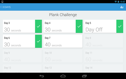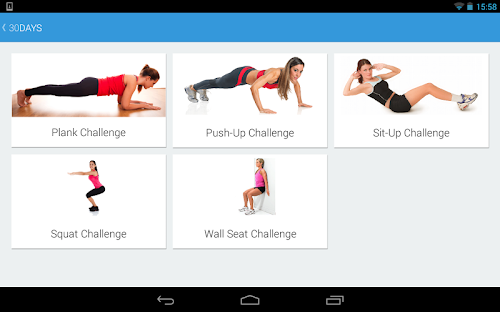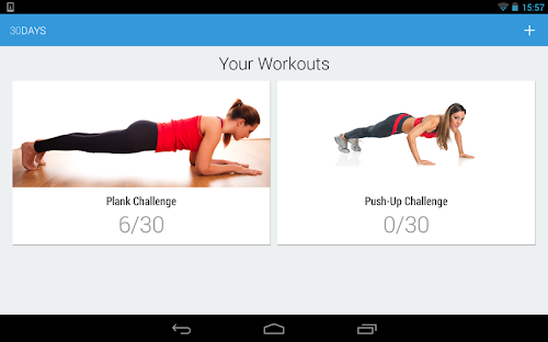 30DAYS gives you 30 day training programmes to follow. 30DAYS tailors the workouts to your fitness level. On day 1 you do as many / long of the exercise as you can, then 30DAYS works out a training plan for you.