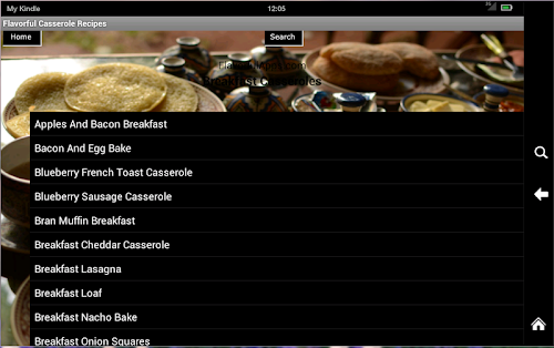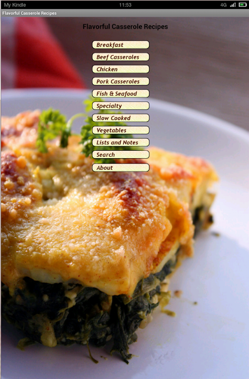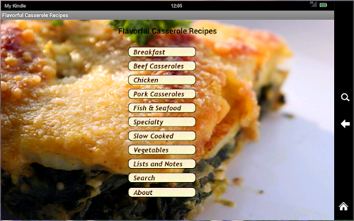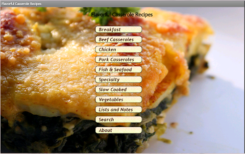 This application offers over 350 tested casserole recipes that are all categorized within the main menu for easy navigation and access: