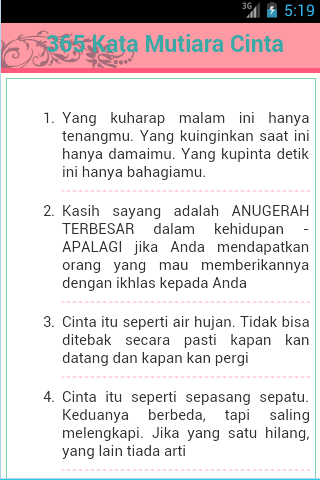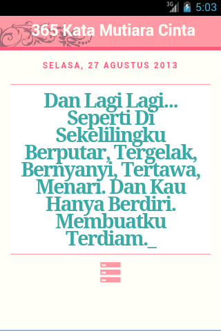 1 hari 1 kata mutiara cinta, 365 kata mutiara cinta, kata bijak dan motivasi pilihan yang bisa kamu buka setiap hari selama satu tahun. Aplikasi ini menampilkan kata-kata mutiara cinta, bijak dan motivasi setiap hari selama 365 hari dalam setahun untuk memotivasi dan menginspirasi hari-hari indah kamu.