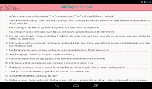 1 hari 1 Rayuan Gombal, 365 Rayuan Gombal berbeda setiap hari selama 1 tahun. Cocok buat kamu yang lagi jatuh cinta atau sekedar ingin menghibur pasangan dengan rayuan dan kata-kata manis dan lucu.