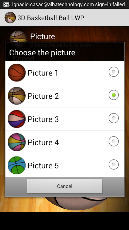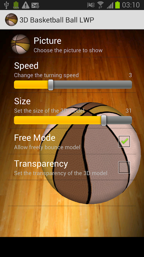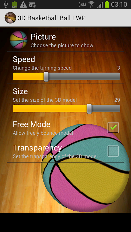 After selecting “3D Basketball ball”, you can configure the APP on “settings”. Also you can change the color, allow free bouncy, change turning speed, modify its transparency and adjust the size.