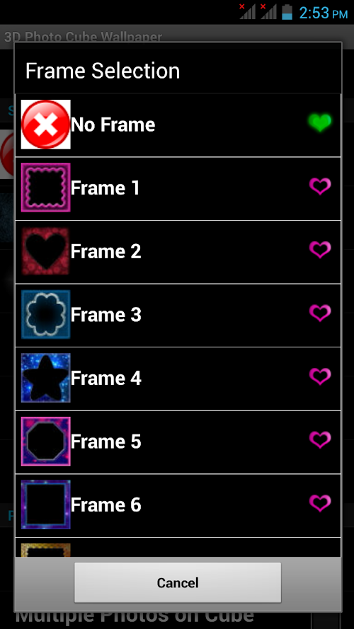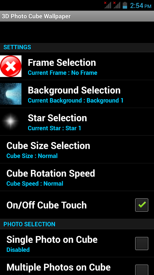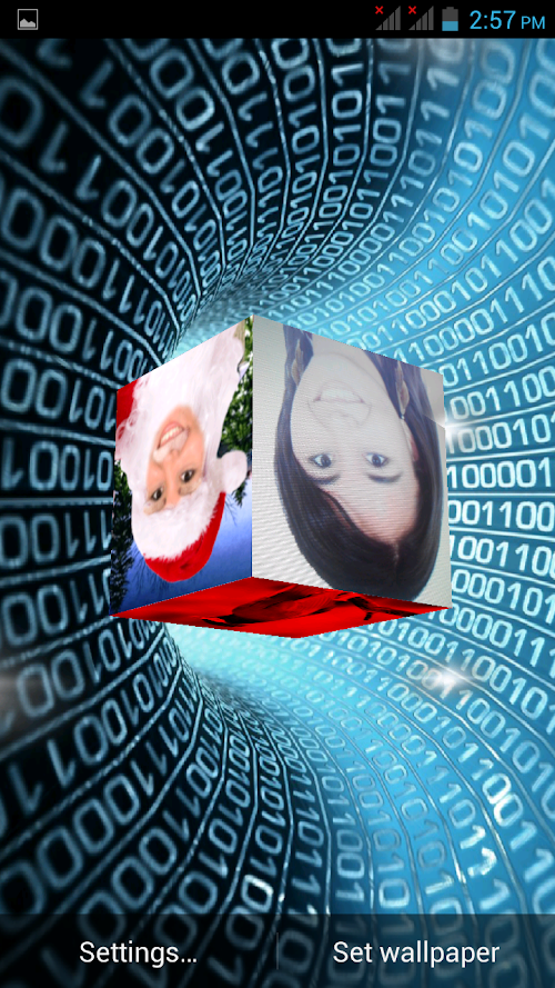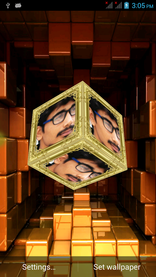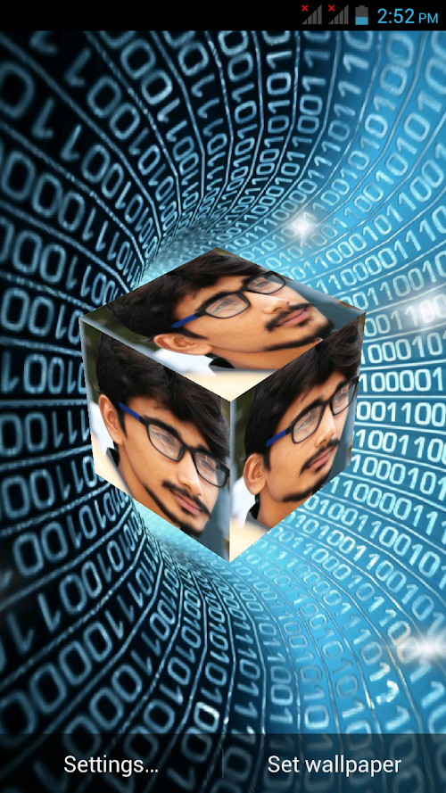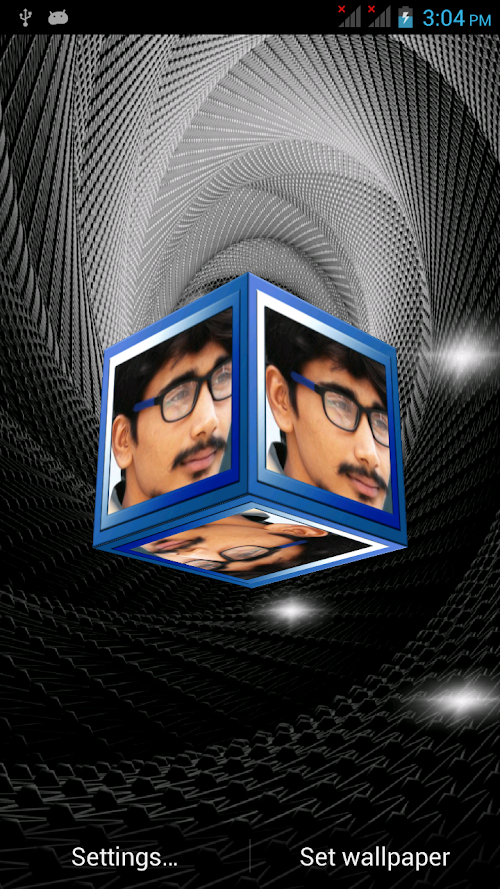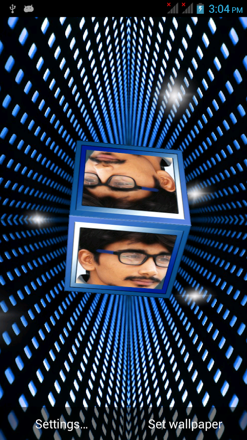 This Free App is specially created with HD quality 3D Photo Cube Frames Insert your favorite Pics in awesome 3D Photo Cube frames. Decorate your mobile with beautiful 3D Photo Cube with your own photos as mobile backgrounds. This free wallpaper has amazing features like: ◆ Choose your favorite Frame From Frame selection ◆ Select background from various HD background images ◆ Select your favorite star selection ◆ Choose the size of the cube ◆ Choose the Rotation Speed of the cube ◆ On/off Touching the cube ◆ Choose Photo Selection like Single photo/ Multiple photo On cube ◆ Take a new photo from camera or choose photo from your mobile gallery