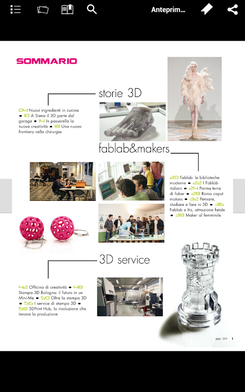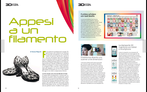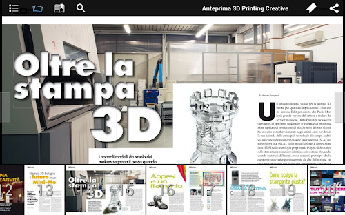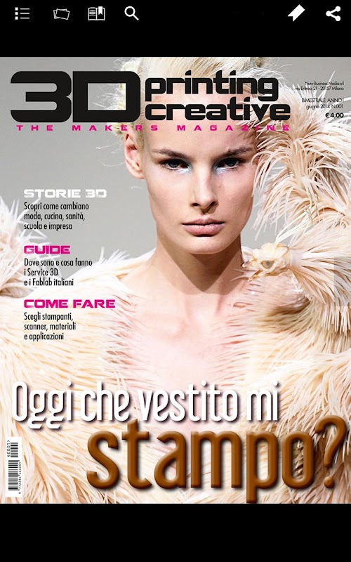 3D Printing Creative mette a disposizione una ricchissima serie di informazioni e di servizi dedicati sia ai professionisti del 3D Printing sia a tutti coloro che utilizzano e utilizzeranno il 3D Printing per ragioni professionali. La rivista vuole essere il testimone di quella straordinaria comunità dei Markers, appassionati, professionisti, imprenditori e artigiani che con il 3D Printing stanno creando nuove soluzioni, nuove imprese e spesso anche nuovi mestieri. La rivista dialoga con il mondo dei FabLab e si propone di raccontare queste straordinarie esperienze. Nello stesso tempo 3D Printing Creative vuole anche essere una guida alle tecnologie, ai materiali, ai prodotti, alle applicazioni e alle soluzioni del 3D Printing con delle vere e proprie guide3D Printing Creative provides a rich set of information and services dedicated to both the professional 3D Printing is for all those who use it and use the 3D Printing for professional reasons. The journal aims to be the witness of the extraordinary community of Markers, enthusiasts, professionals, entrepreneurs and craftsmen with 3D Printing are creating new solutions, new businesses and new jobs too often. The magazine talks to the world of the FabLab and aims to tell these extraordinary experiences. At the same time, 3D Printing Creative also wants to be a guide to the technologies, materials, products, applications and solutions of 3D Printing with real guides