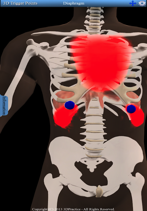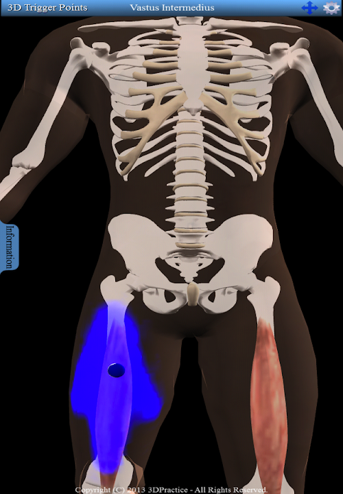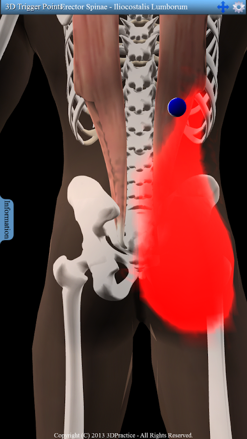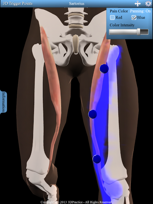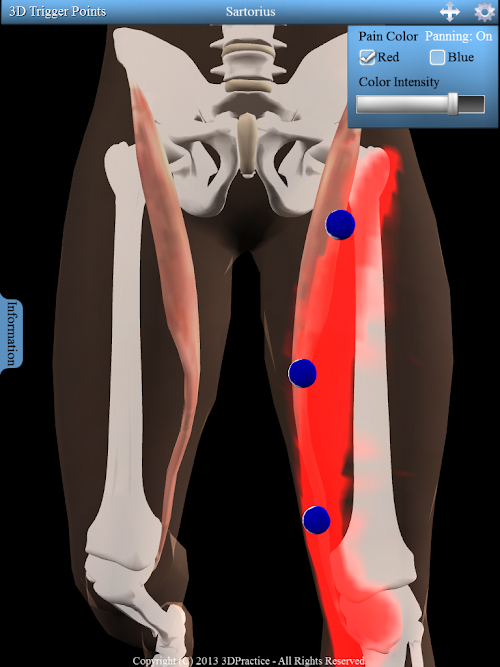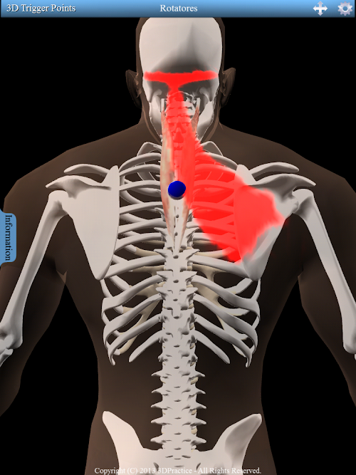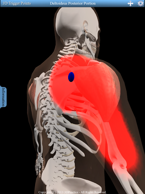 Interactive 3D model with 158 trigger points and 100 referred patterns. Information tab displays each muscles origin, insertion and nerve innervation. Supports multi-touch gestures including pinch to zoom, swipe to rotate and tap to select. Includes a pan button to move the 3D model. Along with fully interactive 3D functionality this app also let's the user easily toggle the pain pattern color between red and blue while increasing or decreasing the intensity of the color.