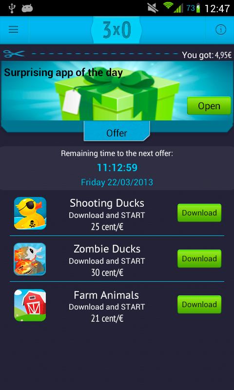 3x0 Free Apps is an application that works for you. It searchs for fun and interesting applications and rewards you with the download, enjoy the best app's from Play StoreAlso we often have paid app's completely free for you, remember this appns are for limited-time so donnt miss any.Just click the download button and you will be redirected to the Play Store, where you can download the selected application. Remember this app's are for limited-time , and best of all, when you get at least € 5, request it and we give you the credit to use it on whatever you want
