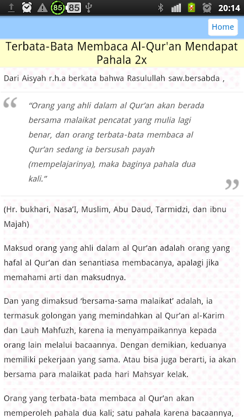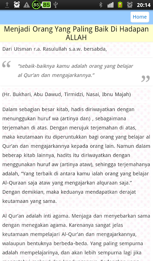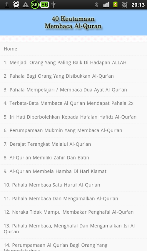 Nah di aplikasi ini, anda bisa menemukan 40 Hadits keutamaan / Fadhilah Al-Quran bagi yang membacanya, mempelajari dan mengamalkan apa yang terkandung didalamnya.