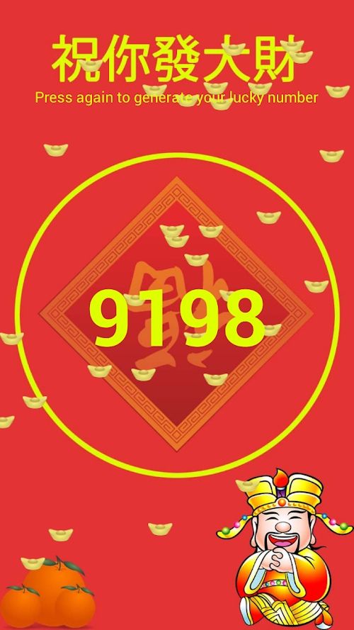 Happy Chinese New Year and Gong Xi Fa Cai. 4D Lucky Number will generate your god of wealth lucky number that will bring you to the next level of achievement, success and wealth. Use this to generate a random lucky number for your day. This number generator will definitely bring wealth and luck to you. Designed with piles of gold raining on you, it will definitely make your four digit a powerful number for you to buy lottery. You can also use the four numbers to buy Magnum, Toto, Da ma Cai or any other lottery. Go ahead, use this lucky number and get your god number and make you one step closer towards great wealth and be a king.
