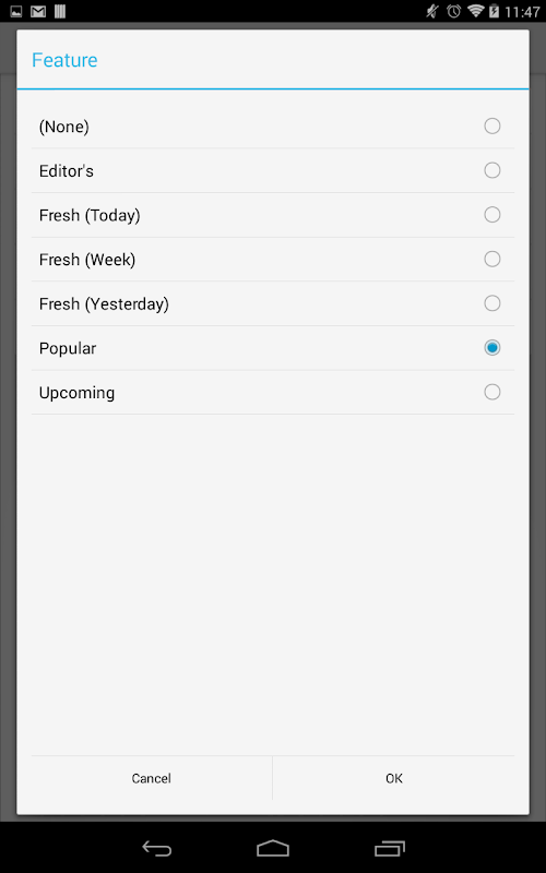 - 7 different data sources: (None), Editor's, Fresh (Today), Fresh (Week), Fresh (Yesterday), Popular, and Upcoming