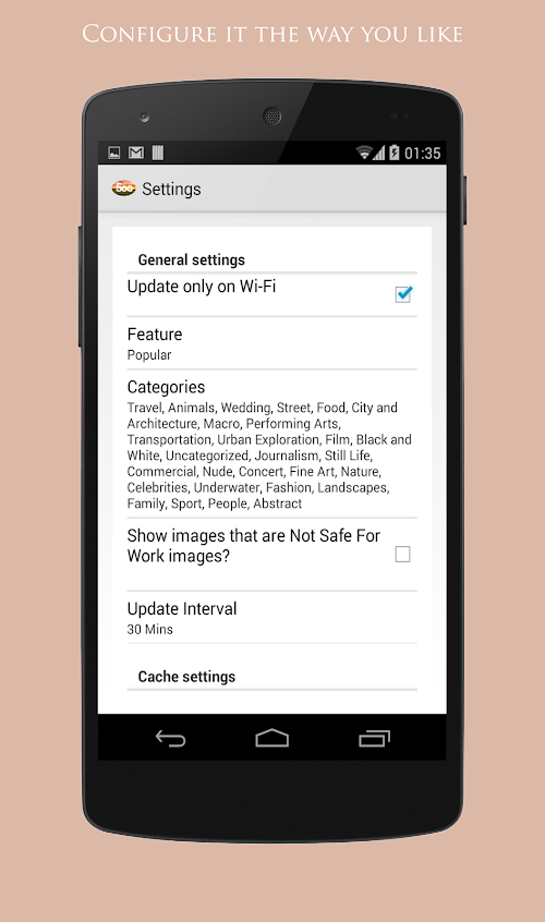 - Cache: Use seen pictures when no connection is available. Save cached pictures to gallery
