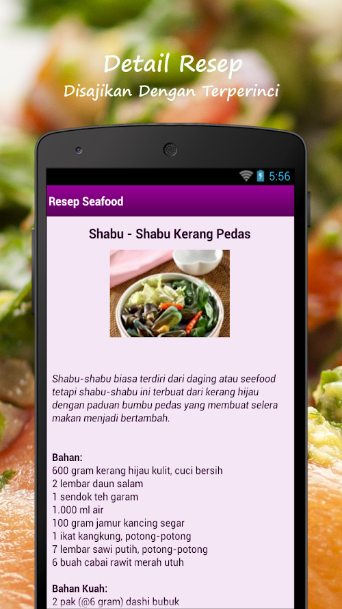 Tidak pelu lagi mencari resep kesana kemari karena aplikasi ini memiliki lebih dari 700 resep masakan ikan-ikanan dan akan terus kami update. Lengkap dari bahan-bahan yang diperlukan hingga cara pembuatannya beserta fotonya.