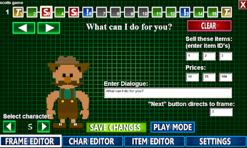 Shop- This frame consists of a shopkeeper, which you will pick from you list of created characters, as well as a selection of three weapons. Enter the text for the shopkeeper, as well as the item ID numbers and prices of the three weapons you wish you sell in this shop.