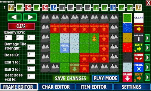 Overworld- This is the overworld map. You can have as many of these as you like and link them together through exits to make the world as large as you wish. Each overworld can have three total exits, two labeled as "exit 1" and "exit 2" which can lead to shops or other frames, and the third exit, which is where the player will go after defeating a boss. Set these options on the left hand side of the overworld menu so the game will know where these exits will lead. Here you can also enter enemy ID numbers so the game will know what enemies the player will encounter on this map, as well as the boss ID. Character ID's are displayed at the top of the character creation page.