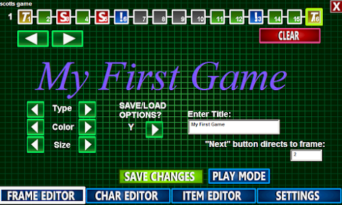 The games you make will consist of frames; each frame can be one of four things, a title, an overworld, a shop, or a cinematic. The game will always start on frame 1, but from there, frames do not have to play in sequence. Each frame will have options to set where a player will go when leaving the frame. To create a new frame, click the "empty" grey frames along the top of the level editor screen. Then pick what type of frame you will create from the menu. Here are the types of frames: