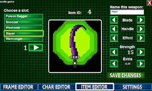 Shop- This frame consists of a shopkeeper, which you will pick from you list of created characters, as well as a selection of three weapons. Enter the text for the shopkeeper, as well as the item ID numbers and prices of the three weapons you wish you sell in this shop.