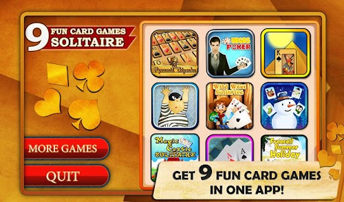 Forgot to bring a deck of cards? No problem! This app brings you 9 addicting solitaire games!! Prepare for hours of fun with 9 different card games. Enjoy classic games along with some new ones! This pack includes classic Solitaire, Freecell, Pyramid, Poker and more!! 9 Fun Card Games- Solitaire will surely pull you out of your boredom!