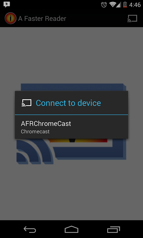 Cast the text you want to read on your TV with "A Faster Chromecast"! AFR uses the "Rapid Serial Visual Presentation" method to allow you to read more words per minute than you can imagine.
