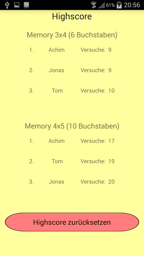 Highscore für die jeweils besten 3 SpielerThis memory combines play and learn.