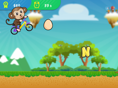 -English pronunciations of alphabets, numbers, and cartoon objects can be heard when the monkey crashes against them