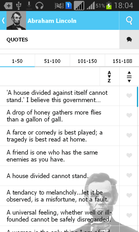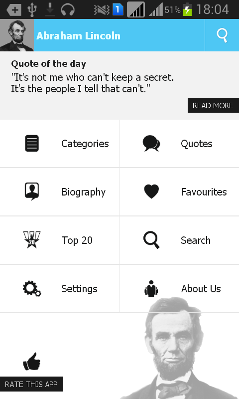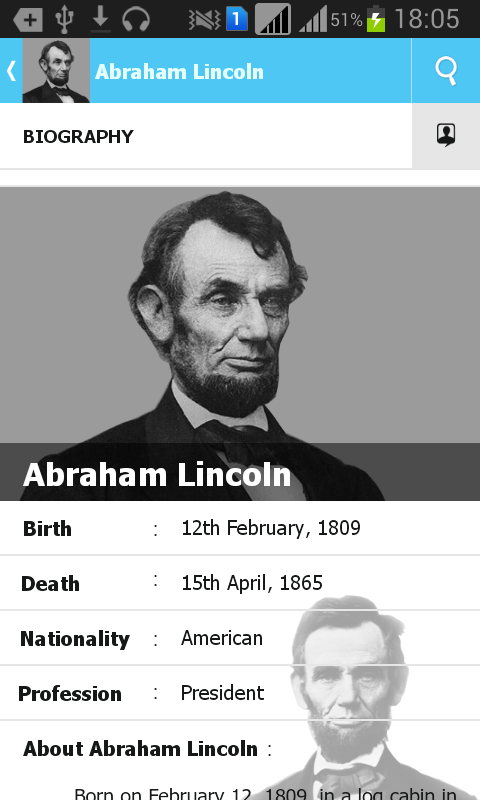 One of the greatest presidents of America, this is the perfect app for all the supporters and fans of President Lincoln. Our application has a full database of all quotes from Abraham Lincoln, that takes you through his entire journey of life and giving you a complete picture of his views on life, politics, democracy etc.