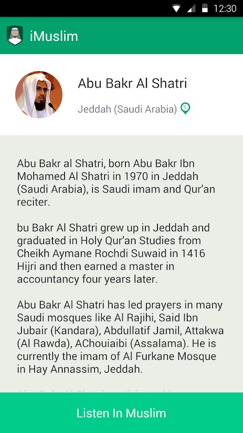 This app provides his brief introduction. If you want to listen to his recitations, You have to download iMuslim.