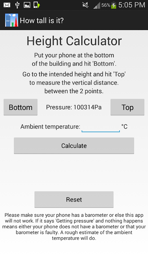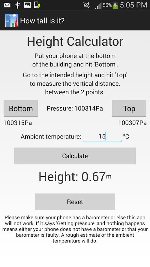 Ever wondered how tall your house is or how far is your classroom or office from the ground? With this app, you can measure vertical distance between two points with an accuracy of a mere 15 centimetres (6 inches).
