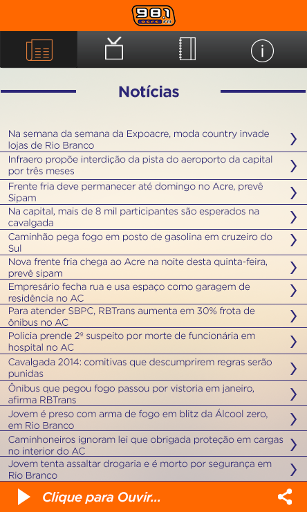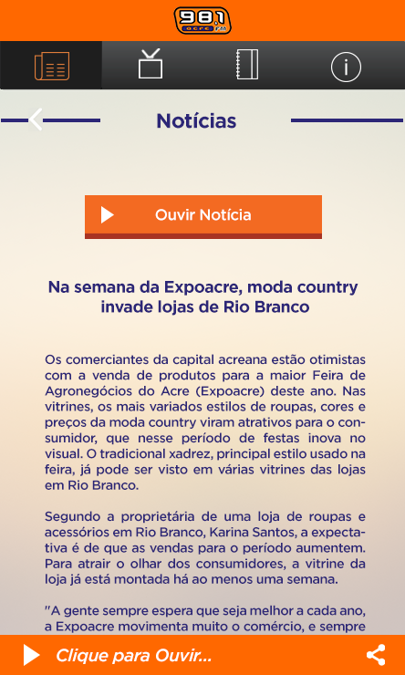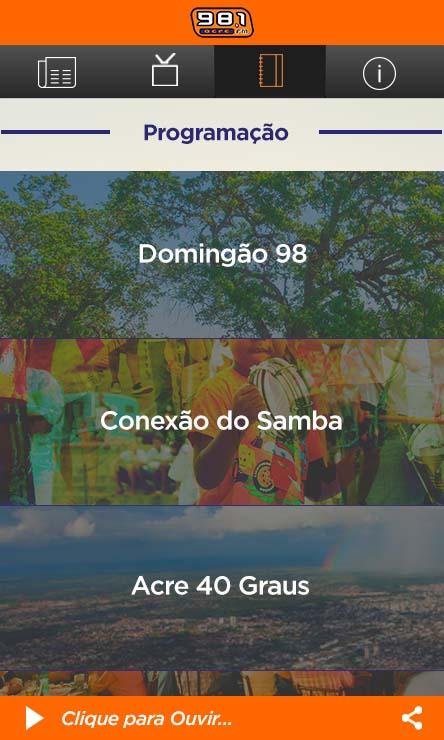 No aplicativo da Rádio Acre FM você ouve ao vivo os programas da emissora, além das principais notícias do dia, agenda cultural, resenha de novelas e informações das celebridades.