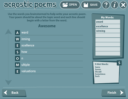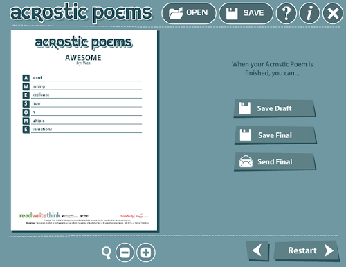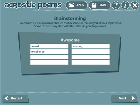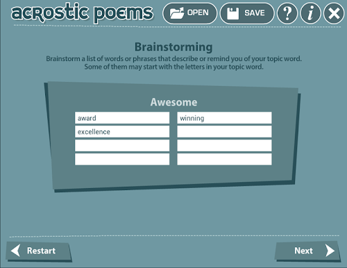 This educational tool allows users to first brainstorm words to help write their poem. Work can be saved in progress to revise and edit, which reinforces elements of the writing process.