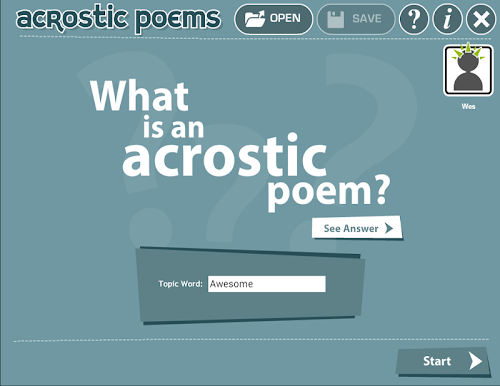 This app mirrors our popular acrostic poem web-based interactive, so users familiar with one can easily adapt to the other. In fact, the two are so similar that users can send their editable .rwt files to an email address and then open their acrostic poem right in the online tool!
