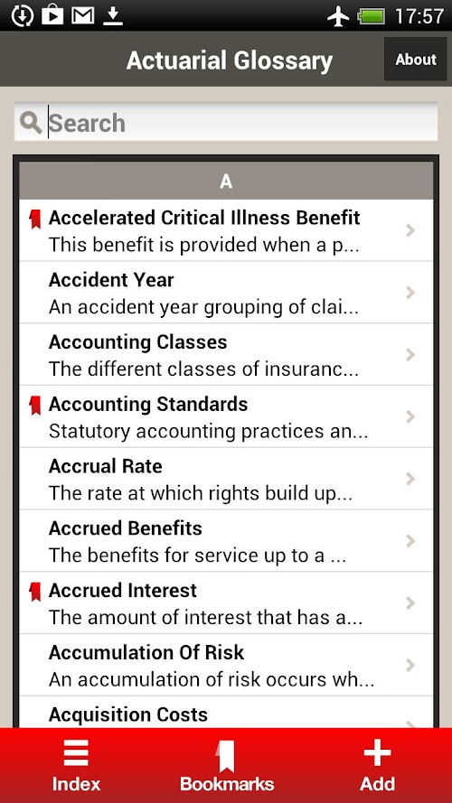 The Actuarial Glossary contains several hundred actuarial terms and their definitions to assist actuaries in their every day work. Terms from the Actuarial Glossary can be shared via email and marked as favorite for easy retrieval. Actuarial Glossary users may also request new terms be added to the Glossary to further enhance and enrich this robust reference tool for actuaries.