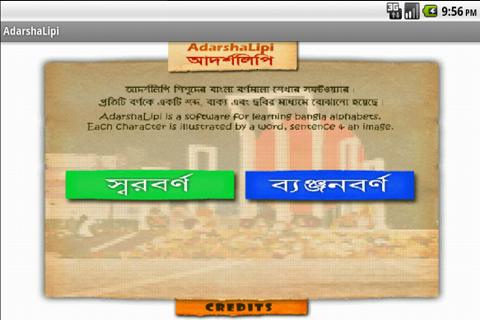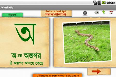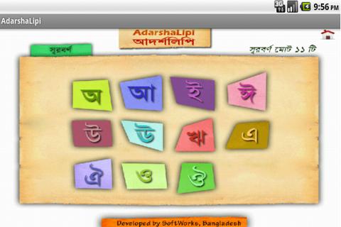 AdarshaLipi is a software for learning Bangla/Bengali alphabets. Bangla alphabets are available in two groups - Sharabarna & Banjanbarna. There are 11 Sharabarnas & 39 Banjanbarnas.