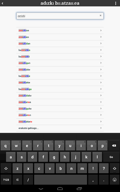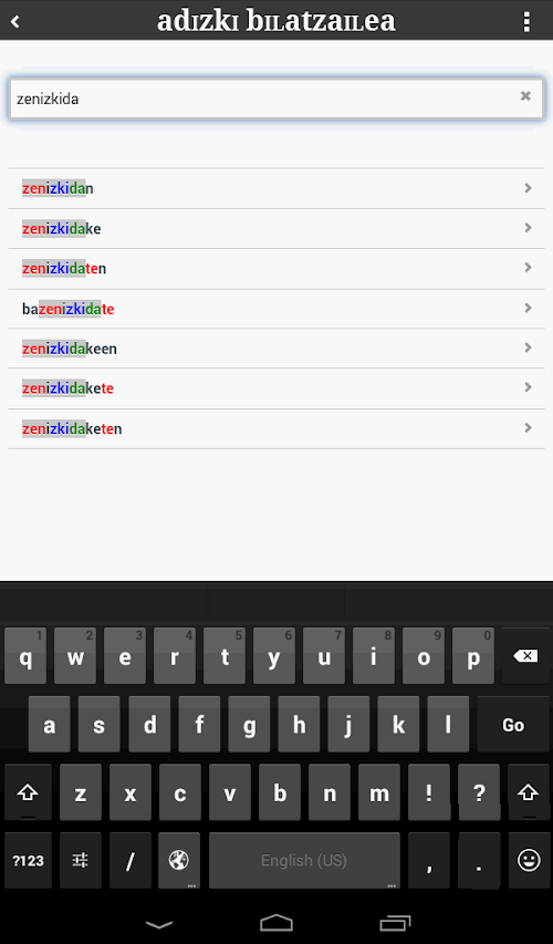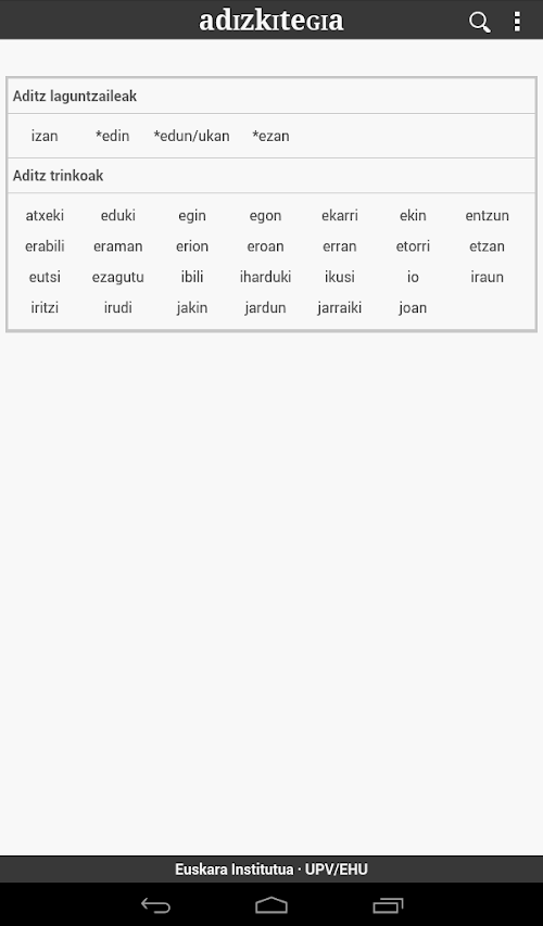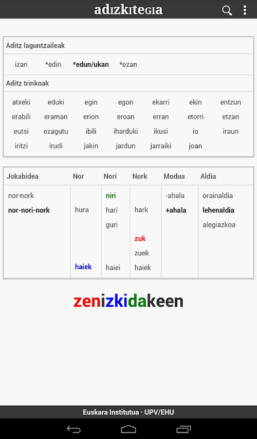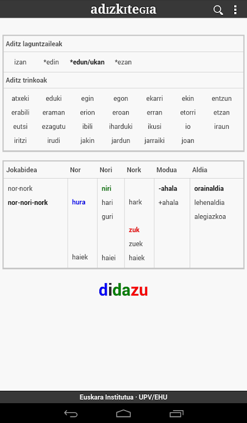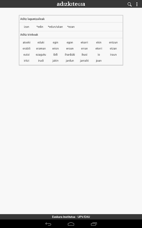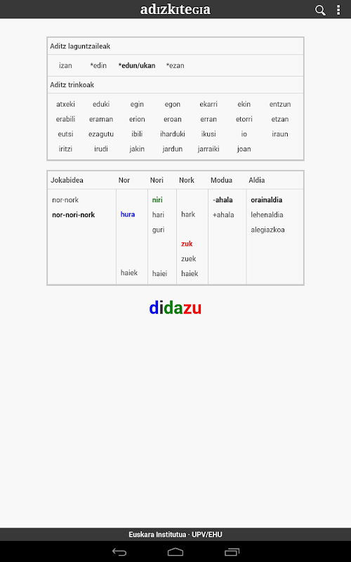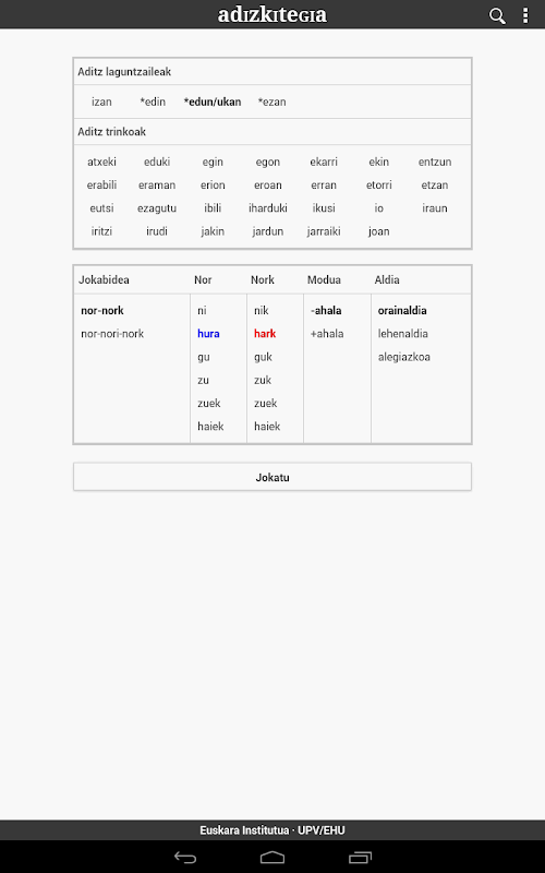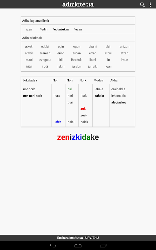 Aplikazio hau aditzak jokatzeko edo adizkiak bilatzeko garatu du Euskal Herriko Unibertsitateko Euskara Institutuak. Adizki egokiak berehala lortu ahalko dituzu. Aditz laguntzaile bat edo aditz trinko bat aukeratu, adizkiaren ezaugarriak: aditz mota (nor, nor-nori...), pertsona, modua (ahalezkoa, ez ahalezkoa, agintera) eta aldia (orainaldia, lehenaldia, alegiazkoa) eta emaitza hortxe izango duzu. Gainera, alderantziz ere egin dezakezu. Adizki baten ezaugarriak jakin nahi badituzu, adizkia edo honen zati bat sar dezakezu bilatzailean, eta aplikazioak bere ezaugarriak erakutsiko dizkizu: aditza, aditz mota, pertsona, aldia eta modua. Beraz, euskal aditz-taulak modu erraz batean eskura izango dituzu aplikazio honekin.Aplikazio hau aditzak jokatzeko edo adizkiak bilatzeko Garatu du Unibertsitateko UPV Basque Euskara Institutuak. Adizki egokiak berehala Lortu ahalko dituzu. Aditz laguntzaile bat bat aukeratu trinko aditz edo, adizkiaren ezaugarriak: aditz Speck (nor, nor-nori ...) pertsona, modua (ahalezkoa, ez ahalezkoa, agintera) aldia eta (orainaldia, lehenaldia, alegiazkoa) eta emaitza hortxe izango duzu . Gainera, ere egin alderantziz dezakezu. Adizki beat ezaugarriak jakin nahi badituzu, edo adizkia honen zati sar dezakezu bilatzailean bat, eta bere aplikazioak ezaugarriak erakutsiko dizkizu: aditza, aditz speck, pertsona, aldia modua eta. Beraz, Basque aditz taulak modu-bat erraz eskura izango dituzu honekin aplikazio.