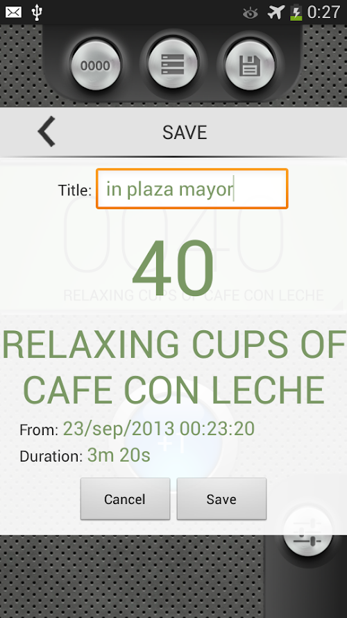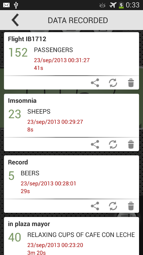 You can save the counts, later you can restart counting and you can also share your counts via e-mail, whatsapp or by any social network (g+, Twitter, Facebook).