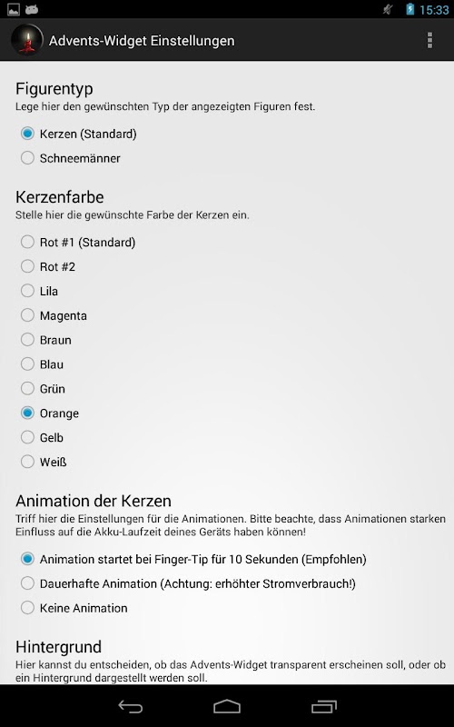 An dieser Stelle möchten wir uns recht herzlich bei allen bedanken, die sich bereits die Mühe gemacht haben und uns per E-Mail über Fehler und Probleme informiert haben. Vielen Dank!Finally, the Advent season is just around the corner and Christmas is approaching. And We Also there are now on your Android smartphone last four Advent candles on a virtual Advent wreath. Download them onto right down and bring Christmas to your favorite device! The widget also keeps you always up to date, as long as you still have to wait for Christmas Eve.