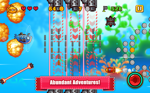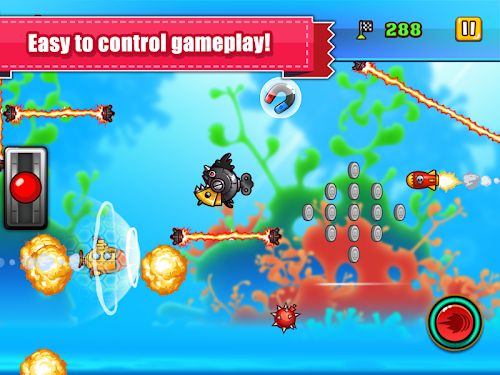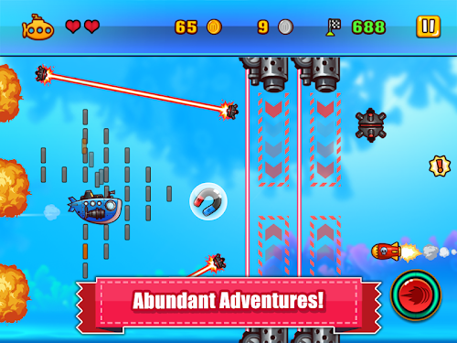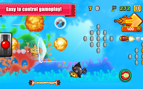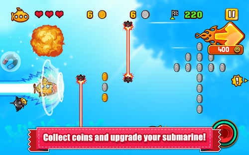 As captain of the submarine, you must use your keen reflexes to maneuver your craft to avoid obstacles on the path, such as dangerous creatures, guided missiles, electricity fields, and magnetic fields. Along the way, you can collect coins and pick up goods to help you on your journey. Stay out of danger, and you will achieve the highest scores and collect numerous coins, defining your legacy on the online leaderboards and owning the ocean.