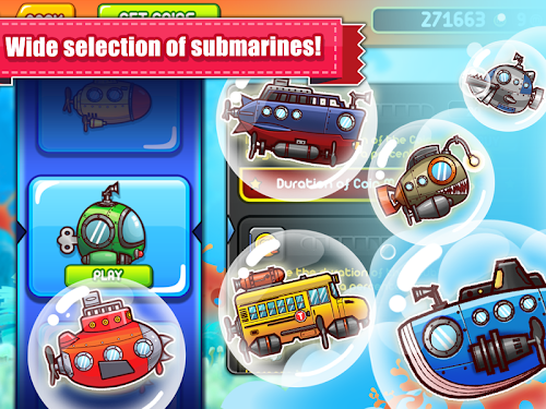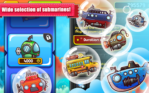 • Many different types of submarines to choose from. Each has its own unique abilities. You can upgrade the selected submarine with more power-ups.