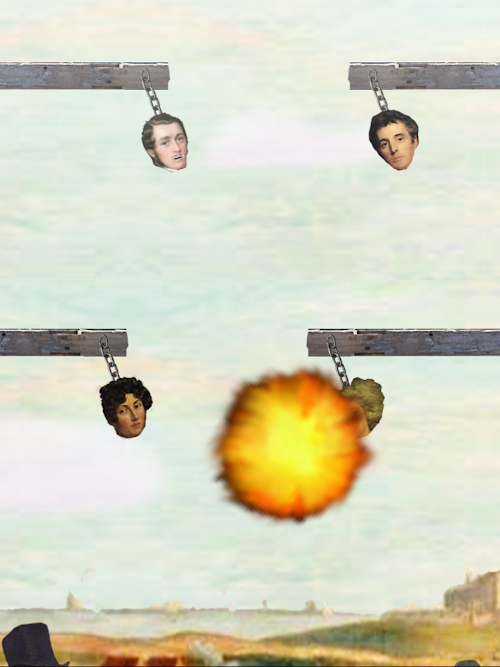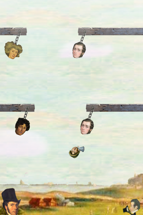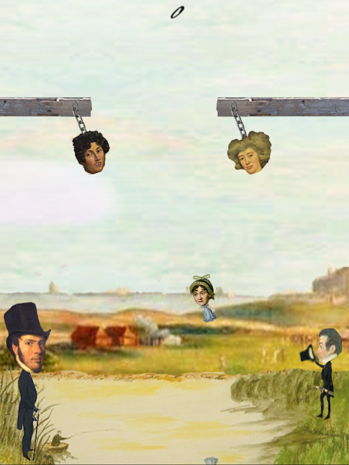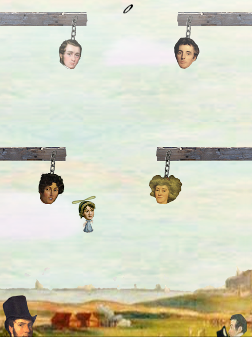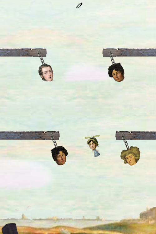 You are Jane Austen! What was the weapon of choice in Jane Austen’s time? Gossip. Tap tap tap to rise above, while avoiding the whispering windbags and prattle of mindless babblers in this Copter game parody. Tap to change direction as you fly up through weathered beams and talking heads that swing maniacally back and forth. Help Jane Austen ascend to a new high score, but be careful, life is much harder than it looks!