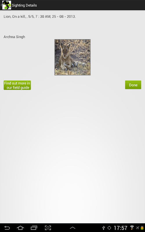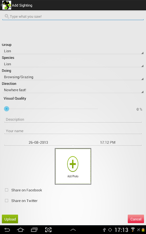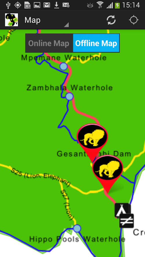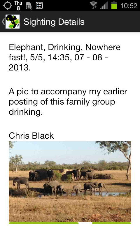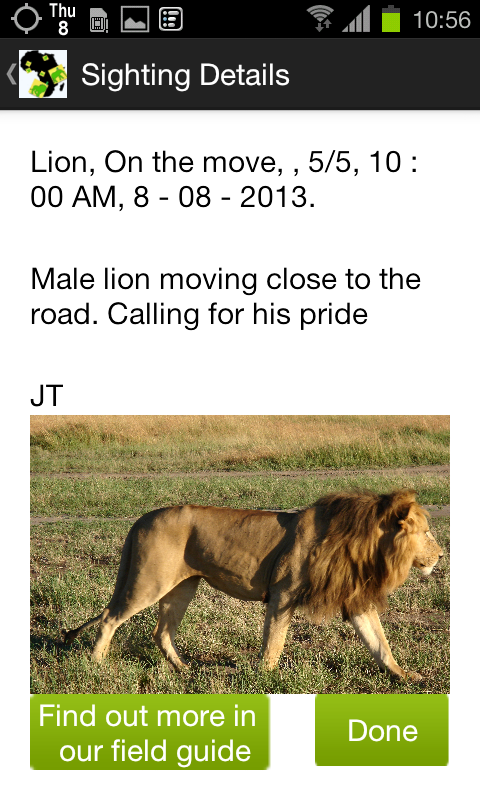 - One-touch to add a sighting to the map yourself, including uploading your own photo. NOTE: because of poaching issues, RHINO SIGHTINGS WILL NOT APPEAR ON THE MAP.